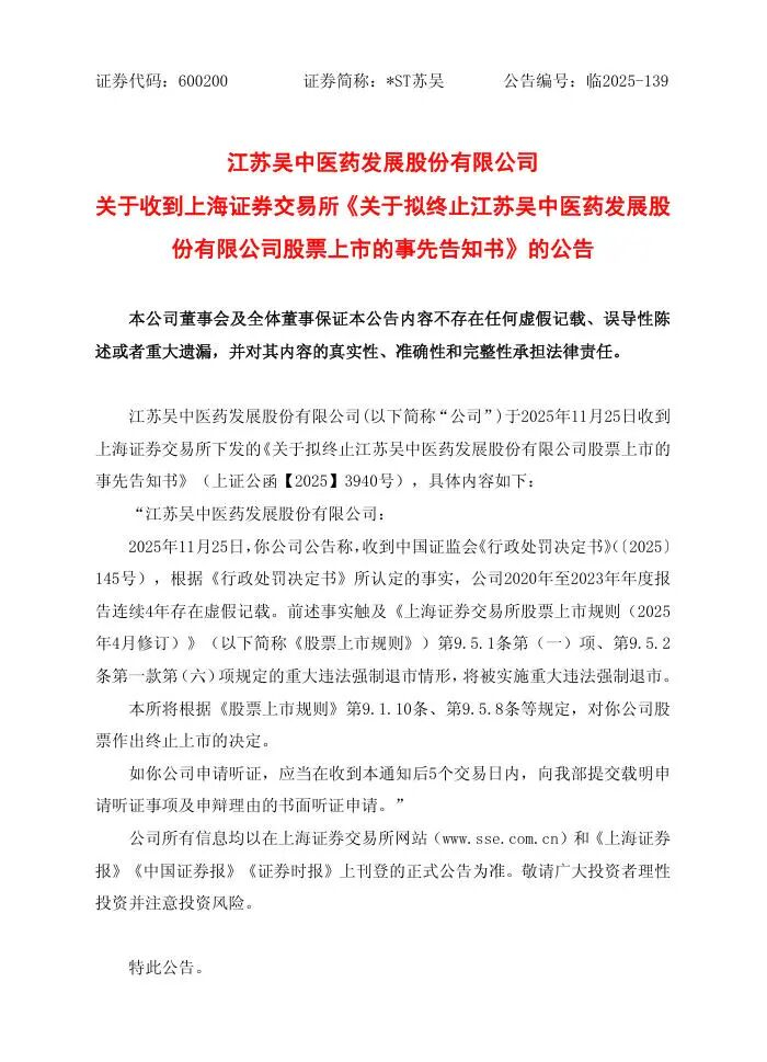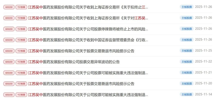 11月25日,江苏吴中医药发展股份有限公司(以下简称:江苏吴中)发布公告称,收到中国证监会下发的《行政处罚决定书》、上海证券交易所《关于对江苏吴中医药发展股份有限公司实施重大违法强制退市相关事项的监管工作函》等文件。